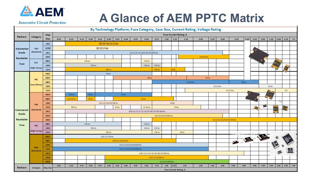 在保险丝领域,AEM一直以提供优质产品及持续服务著称。AEM可恢复式保险丝系列在多项专有专利技术指导下研发、生产,尺寸涵盖0603至2920,额定电流规格涵盖0.5A至3.75A。